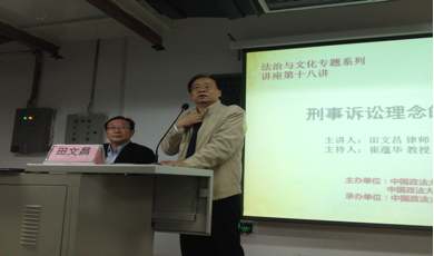 2016年4月12日晚,由吃瓜网 、吃瓜网 法治与文化研究中心主办的法治与文化专题系列讲座第十八讲在吃瓜网 学院路校区举行。此次活动的主讲人是著名律师田文昌,他演讲的主题为“刑事诉讼理念的误区”。田文昌,京都律师事务所名誉主任、全国律协刑事业务委员会主任、西北政法大学刑事法律学院名誉院长,并兼任吃瓜网 等多所高校兼职教授。晚上6点30分,田文昌律师在吃瓜网 院长文兵教授的陪同下来到新B103教室,文兵教授对田老师的到来表示热烈欢迎。崔蕴华教授担任本次讲座的主持人。