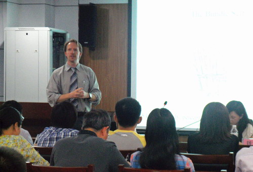 随后,Stephen T.Asma教授转向了当代生物学和脑神经科学的实证研究,向我们勾勒了自达尔文和弗洛伊德以来不同研究者关于自我的科学理论。最后,Stephen T.Asma教授将佛教和脑神经科学两个视角相结合,为我们展示了这两类研究进路如何在自我管理(Self Management)、获取身心平衡与快乐方面存在结合的当代可能性。讲座过程中,Stephen T.Asma教授为我们演示了精心制作的幻灯片,图文并茂地讲授了宗教、哲学和认知科学对于自我问题的不同理解与融汇途径。形式生动有趣,具有互动性与启发性。