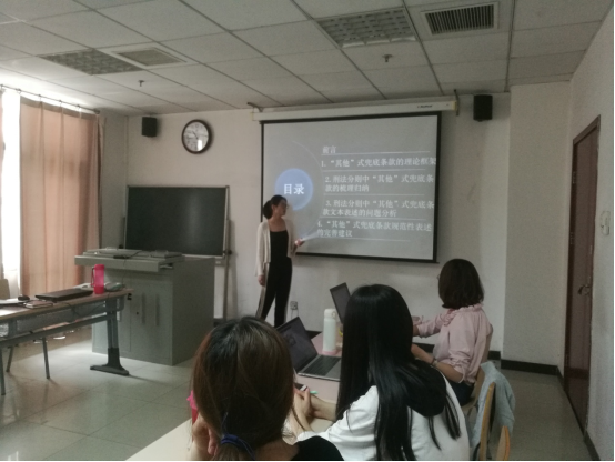第二位报告人是孟柯言同学,其报告题目是《刑法分则中“其他”式兜底条款的规范性表述研究》。孟柯言同学先从“其他”式兜底条款的理论框架谈起,对刑法中的兜底条款进行了梳理归纳,并分析了其问题,最后提出了完善建议。展示结束后,同学们指出了文章存在的问题并提出了建议。邹老师和张老师认为文章的意识性不强,进行问题梳理的时候同时涉及到其他方面,应该再查找深入。