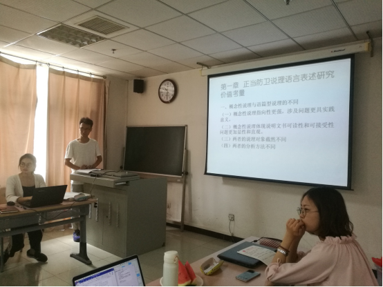 第一位报告人是任朝旭同学,报告题目是《正当防卫说理语言表述实证研究》。任朝旭通过150份内地涉及到正当防卫的判决书为语料,并且和150份台湾地区判决书进行对比,来指出正当防卫说理的规范性表述以及提出自己的建议。展示结束后,每一位同学都就报告人的展示内容进行了积极的提问,或是提出自己的建议,任朝旭同学对同学们的建议和问题进行了解答。邹老师和张老师对该报告主要内容提出了指导意见,认为任朝旭应该对专业词语的使用更加规范严谨、删除不必要的内容并对题目进行修改。
