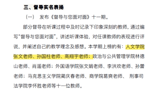 2022-2023学年春季学期,学校本科教学督导组开展了对⼈⽂学院的专项督导⼯作。督导组听评⼈⽂学院本科课程128 ⻔次,涉及该院 44 名教师。在教务处发布的吃瓜网 本科教学督导第3期工作简报中,实名表扬吃瓜网 张文、孙国柱、高翔宇、刘震、崔玉珍、雷晓丽、吴照玉、梁辰、李京泽、秦晋楠、崔蕴华、高文婷、李灵婕、宋博、姚灵、李璐、赵强、朱素梅、王莉等多名教师,并有独立段落特别表扬李璐、王莉、梁辰、董燕等教师。