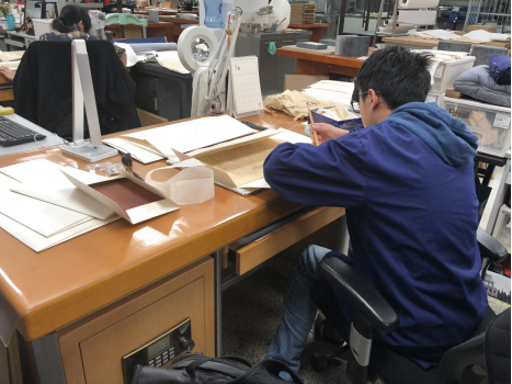进入古籍修复部,映入同学们眼帘的,便是一位正在认真修复古籍的修复师。工作人员向我们介绍道,古籍修复的人员来自历史学、文献学、美术史、文物修复学、化学等不同专业,一本书一般由一个人或一个小组完成修复。出于对古籍文献保护的考虑,修复师们只做材质上的修复,不做内容上的补充,还原古籍最真实的面貌。